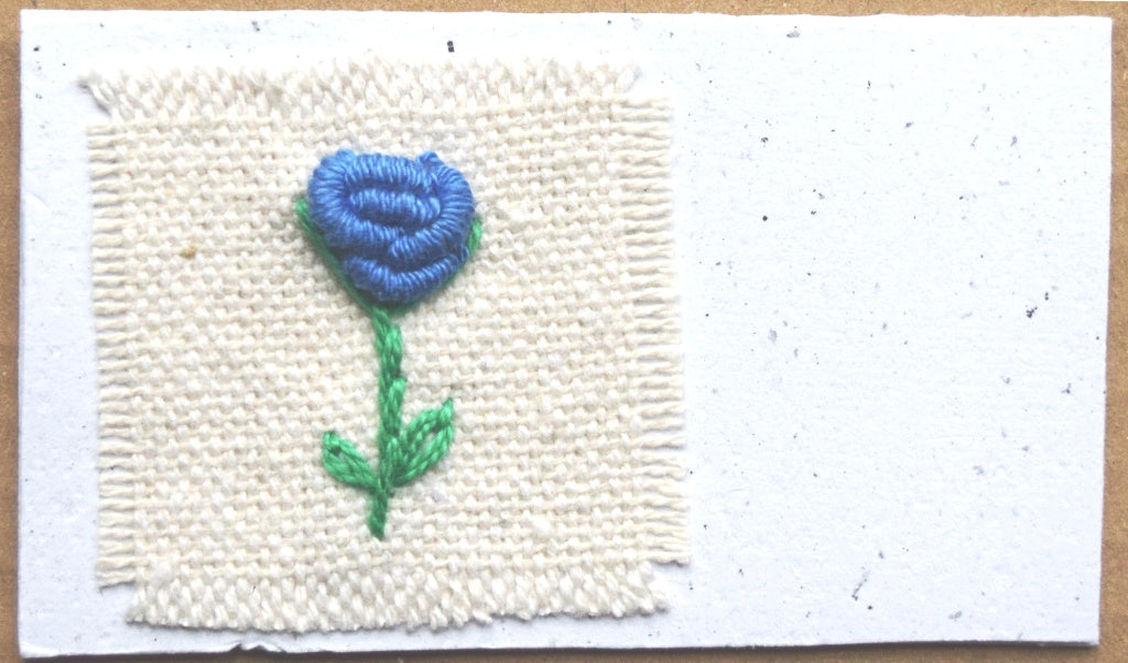 These cards measure 10cm x 5.5cm approx. Handmade paper with a small calico patch embroidered with a single rose. Ideal to accompany a gift or say 'I love you' or 'Thank you'.. Matching envelope. Blank inside.